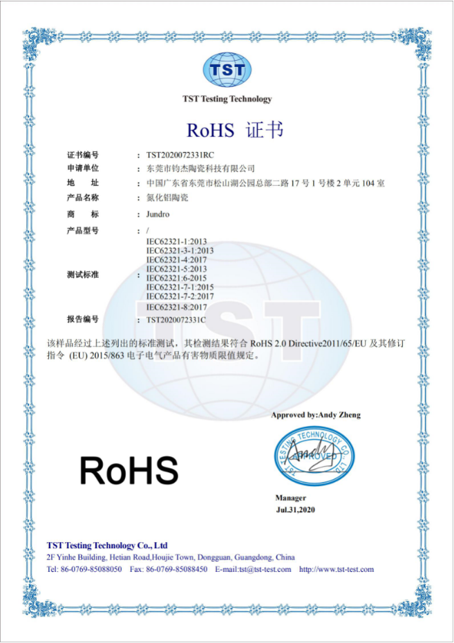 我公司生產的氮化鋁陶瓷采用進口粉料燒結而成,材料通過ROHS認證,安全可靠。