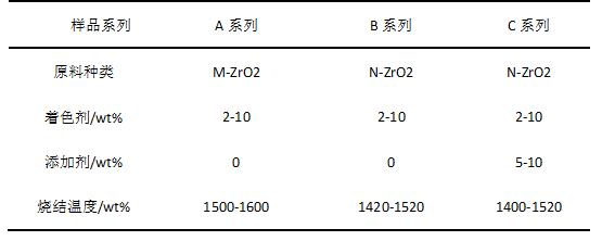 眾所周知,普通彩色陶瓷的制備一般是將色料或著色劑加入到陶瓷坯體或釉料中,通過高溫燒成(一般低于1300℃)而獲得。而氧化鋯陶瓷的燒結溫度較高,一般在1550~1650 ℃。在此溫度下,大多數的色料或著色劑會分解、揮發(fā)。因此,采用簡單添加色料或著色劑的方法,難以制得呈色鮮艷的彩色氧化鋯陶瓷。、 要解決此問題,一方面需通過適當的措施降低燒結溫度,另一方面要添加合適的著色劑及助劑抑制著色劑的分解、揮發(fā)。