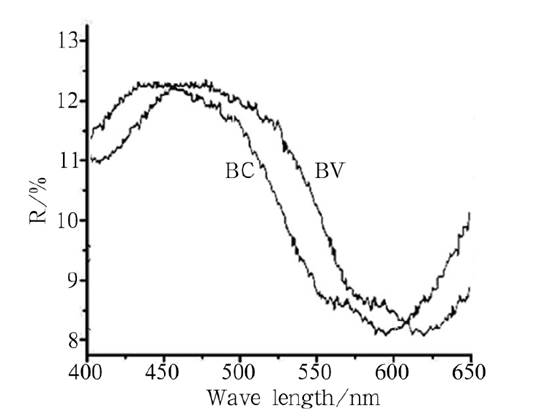 采用紫外-可見光譜儀對制品顏色進行分析,圖中BV 曲線是所制備藍色陶瓷的可見光反射曲線。制品在475nm 具有較強的反射,這是釩鋯藍色料的特征顏色。(備注:BC為如下第三點的數據。)